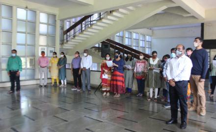 IIT Bombay observed the 152nd birth anniversary of Mahatma Gandhiji. IIT Bombay functionaries including Director of IIT Bombay Prof. Subhasis Chaudhuri, Deputy Director (Finance and External Affairs) Prof. P. M. Mujumdar and Registrar Dr. R. Premkumar garlanded the photo of Gandhiji and paid tributes to the Father of the Nation in the foyer of the Main Building of the campus on October 02, 2021