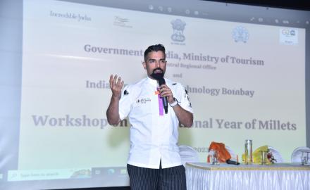 To commemorate the International Year of Millets (2023), IIT Bombay and India Tourism Mumbai organized a joint workshop on February 28, 2023 at P.C. Saxena Auditorium. Students from various Mumbai colleges attended the workshop in large numbers. Mr. Jerson Fernandes, Executive Chef at Novotel Mumbai, hosted the session. Mr. D. Venkatesan, Regional Director (West and Central Region), India Tourism